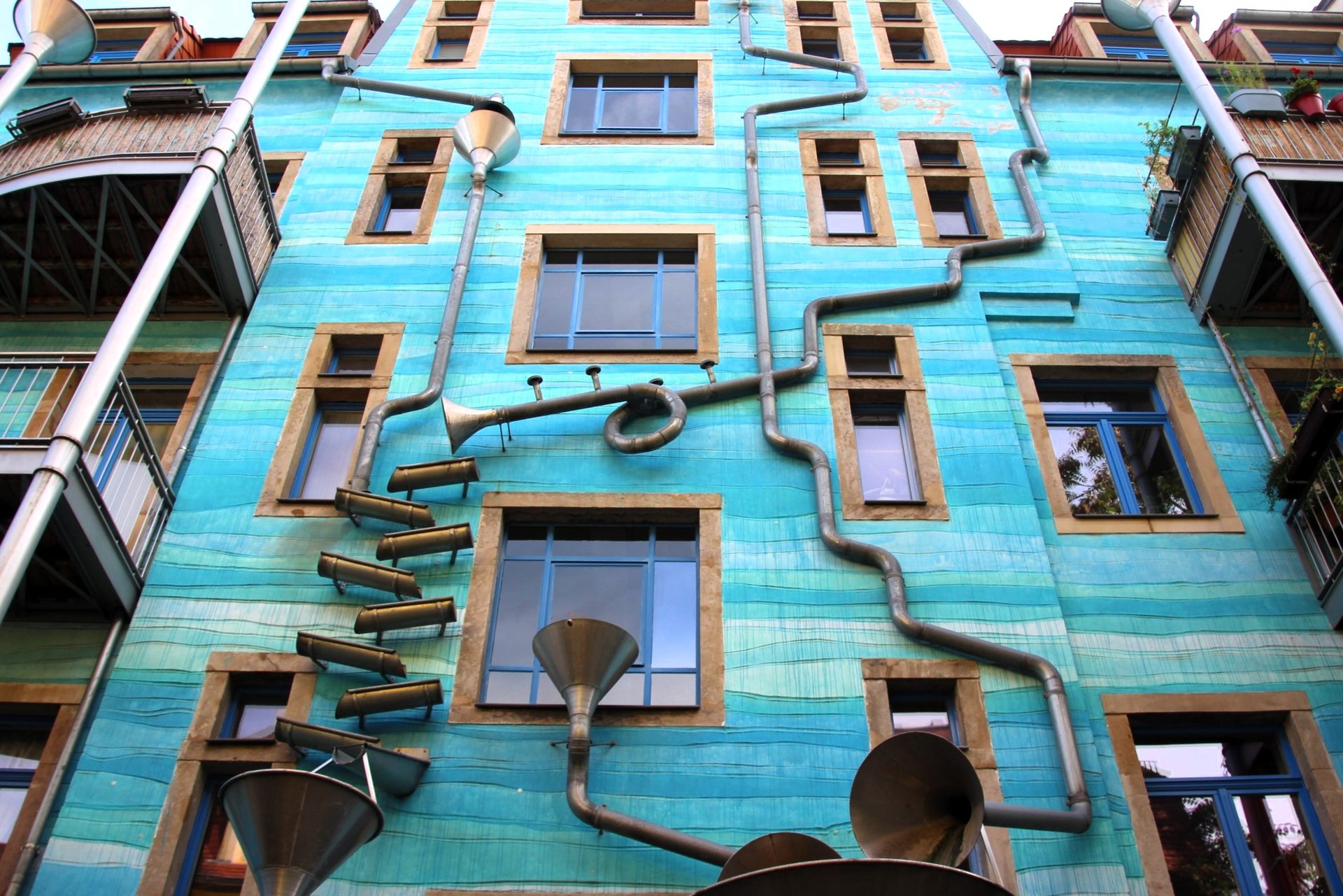 🌻 В одном из дворов — Hof der Fabelwesen — вас ждут магические создания и удивительные детали, которые оживают на стенах. 💙 В Hof der Metamorphosen можно наблюдать за удивительными изменениями поверхностей — 24 различных бумажных фактуры плавно трансформируются на глазах у внимательных посетителей. 🌂 А вот в Hof der Elemente стены делают не просто архитектурное шоу, а настоящую музыку! Когда идёт дождь, вода, стекающая по специальным трубам, превращает двор в музыкальный инструмент! 🌧🎶