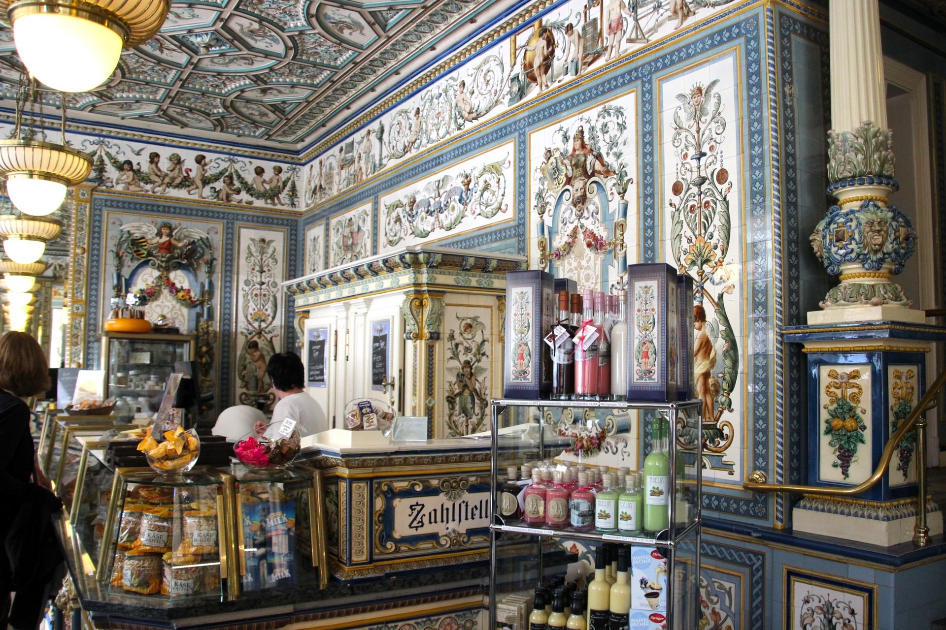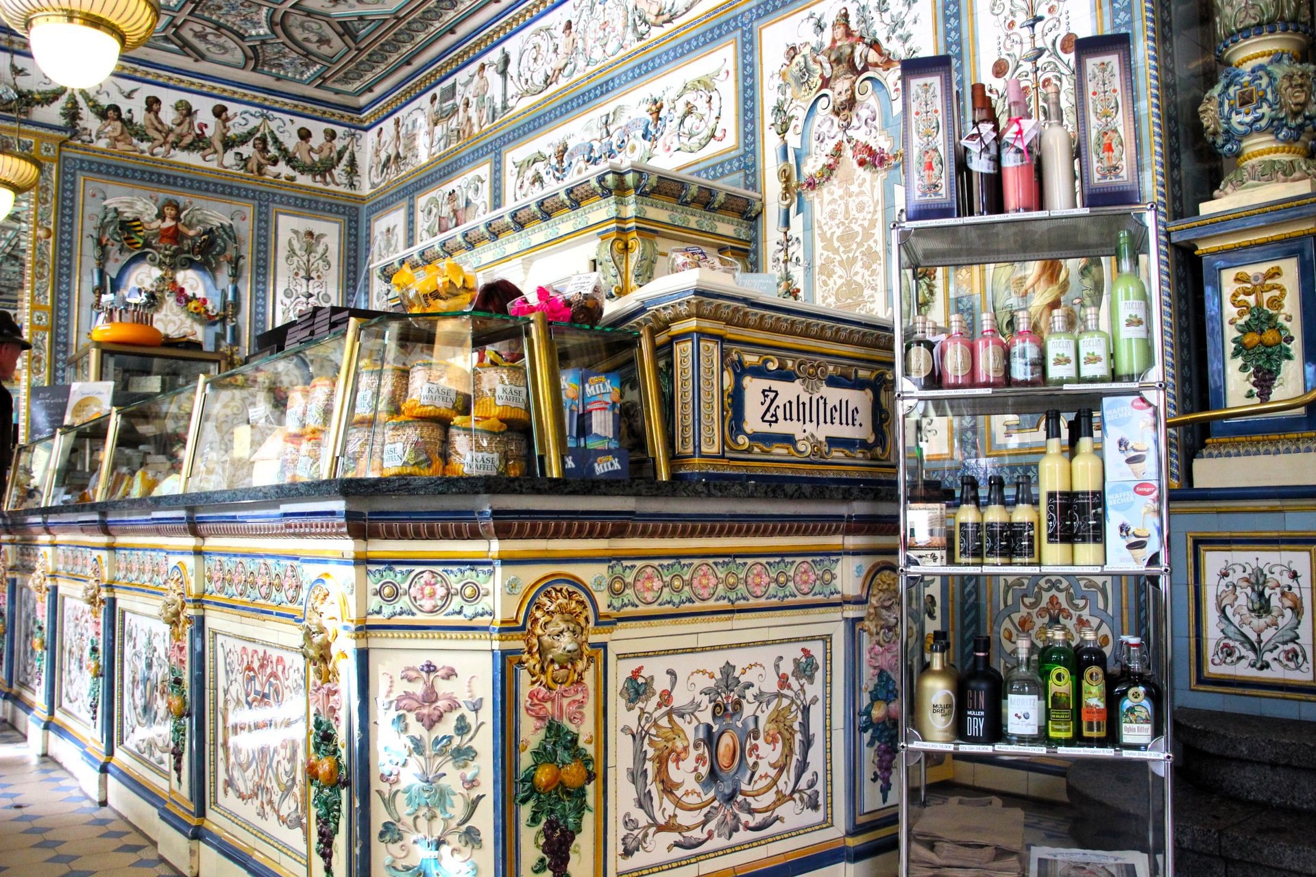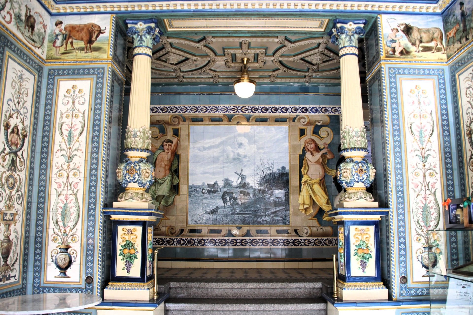 ✨ При входе вас встречает невероятный интерьер, оформленный фантастически красивыми майоликовыми плитками с яркими изображениями из мира молочного производства, мифическими существами и цветочными узорами в стиле неоренессанса. 🌟 Эти ручные росписи на стенах, полу и прилавках — настоящие произведения искусства от знаменитой керамической фабрики Villeroy & Boch, которая находится в DRESDEN. 🎨💚